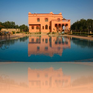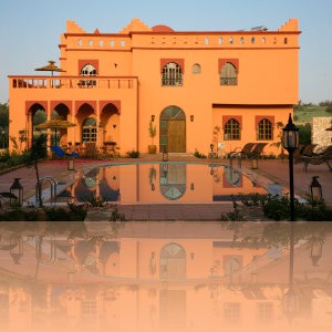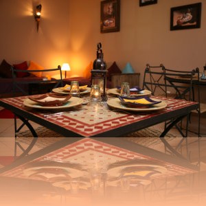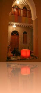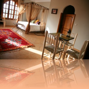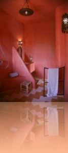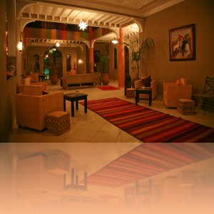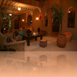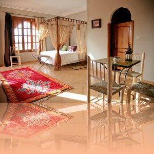 Le riad Les Deux Mondes opte pour un esprit sobrement ethnique et plutôt décontracté, avec quelques belles surprises dans le choix et la conception de certains meubles sur fond de peintures grises pour humaniser les volumes que l'on devine imposants depuis l'extérieur.
